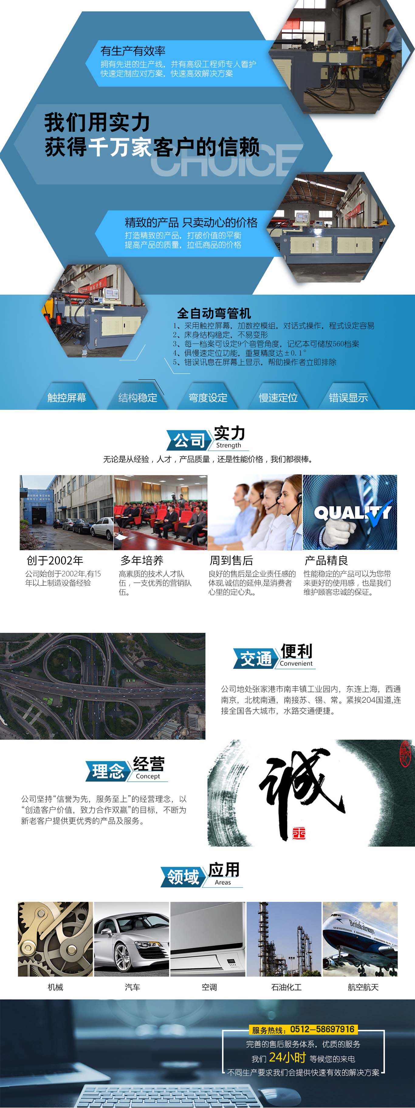 張家港市雙和機(jī)械制造有限公司始建于2001年,占地面積12000平方米,南鄰蘇州、無錫、上海,東鄰常州、南京,交通便利,位長三角中間地段,風(fēng)景優(yōu)美的張家港。 雙和公司至創(chuàng)立開始,引進(jìn)了國外的設(shè)計制造理念,組建了企業(yè)生產(chǎn)管理優(yōu)秀團(tuán)隊,致力于管材加工機(jī)械研發(fā)、設(shè)計、制造。創(chuàng)新的設(shè)計理念,嚴(yán)格的質(zhì)量把關(guān),專業(yè)的售后服務(wù),不斷提升了我在整個行業(yè)的影響力。 雙和公司生產(chǎn)的系列產(chǎn)品分為彎管機(jī)、切管機(jī)、縮管機(jī)、磨齒機(jī)、伺服彎管機(jī)、數(shù)控彎管機(jī)、液壓彎管機(jī)、自動切管機(jī)、管端成型機(jī)、倒角機(jī)、大弧滾圓機(jī)、鋁切機(jī)、壓彎機(jī)等管材加工機(jī)械,廣泛用于航天業(yè)、造船業(yè)、汽車制造、鍋爐制造、自行車、摩托車、體育健身器材、管制品家...
